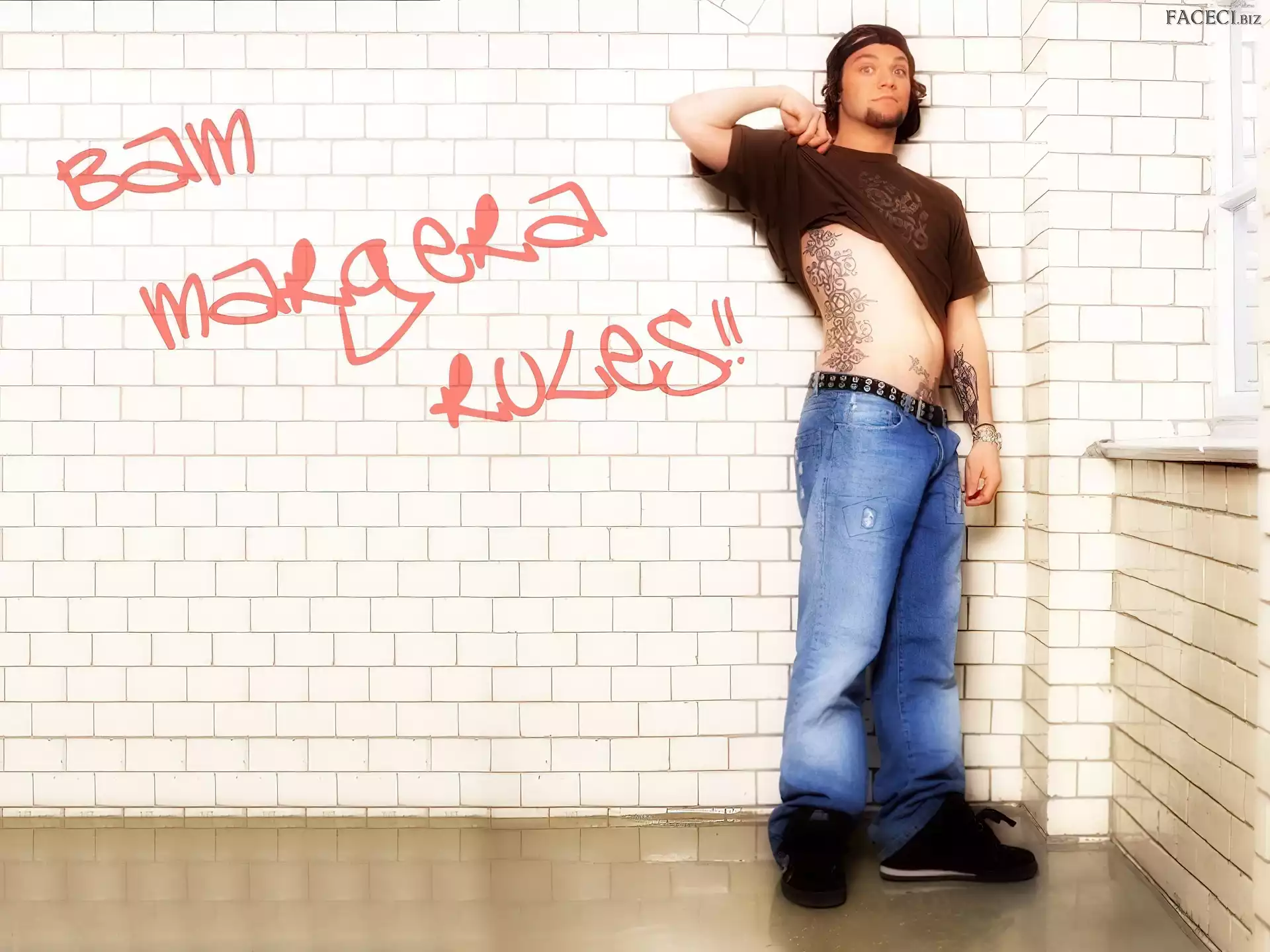 t-shirt, Bam Margera, brązowy kurtka, Bam Margera, rozpięta zegarek, Bam Margera, deskorolka włosy, Bam Margera, ciemne okulary, Bam Margera, butelka okulary, Bam Margera, twarze